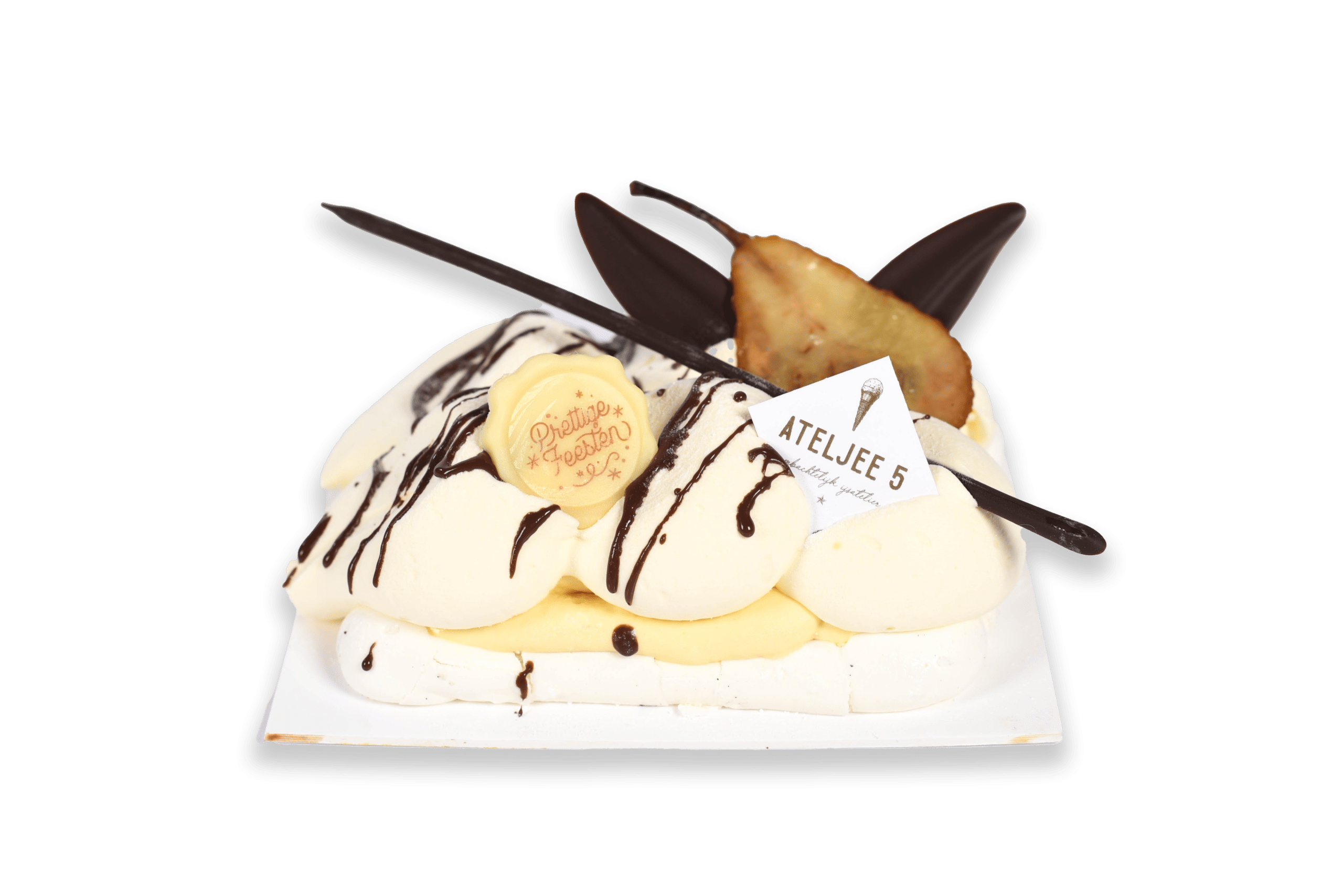 Omschrijving: Krokante meringue bodem , zacht van binnen , opgevuld met een compote van peren, perensorbet en een vanilleparfait, afgewerkt met een vleugje chocoladesaus.